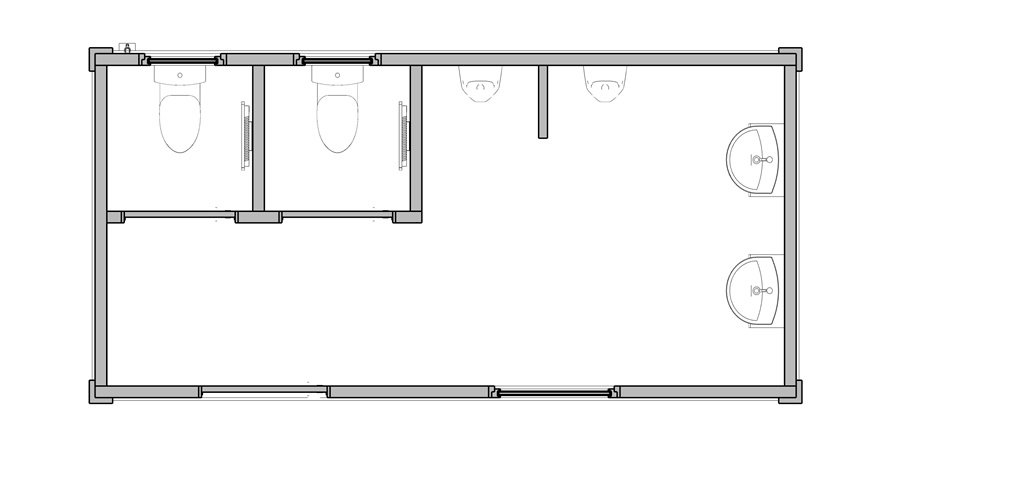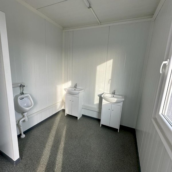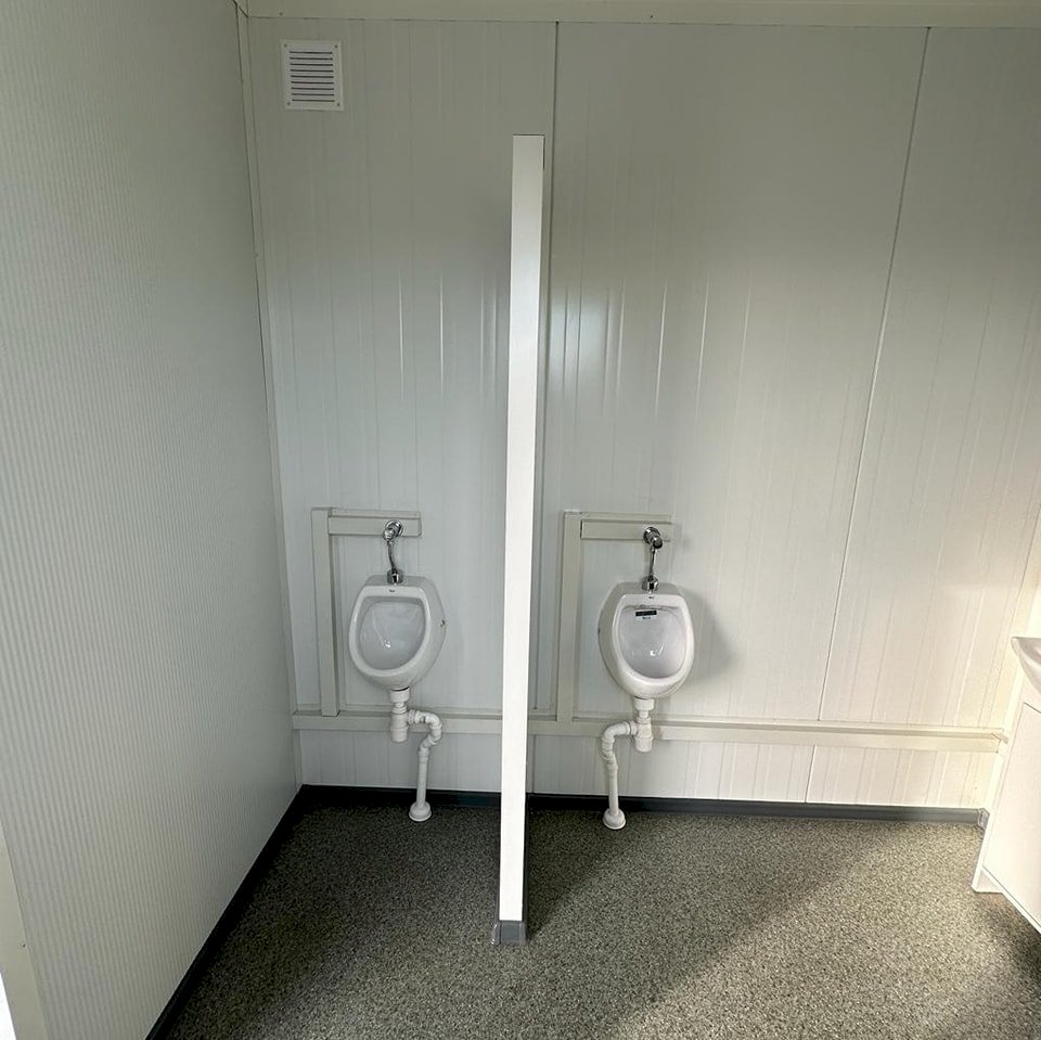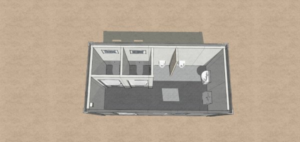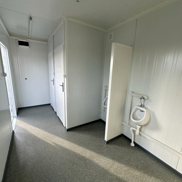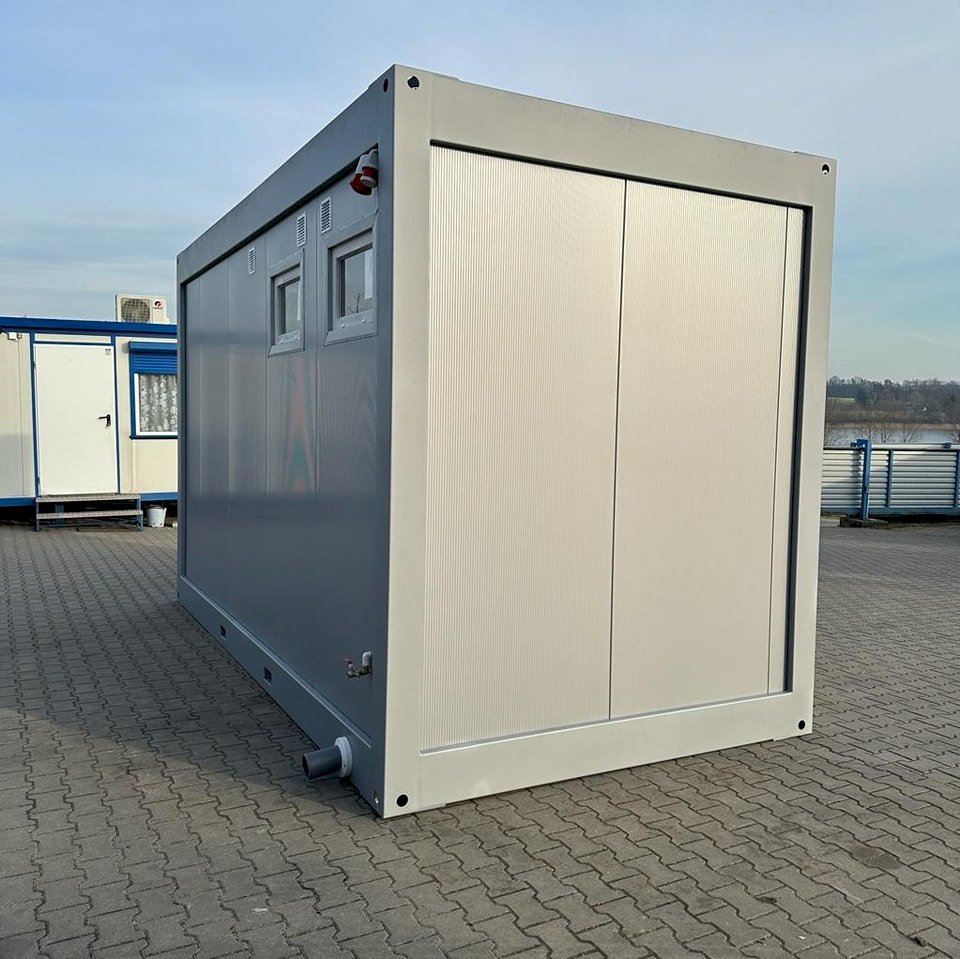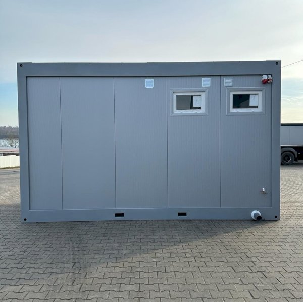 Kontener sanitarny o wymiarach 4885 mm długości i 2438 mm szerokości, z minimalną wysokością użytkową wewnątrz 2500 mm oraz maksymalną wysokością zewnętrzną 2990 mm. Wyposażony w osobne kabiny z toaletami i pisuarami, zaprojektowany z myślą o wygodzie i higienie użytkowników.