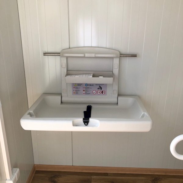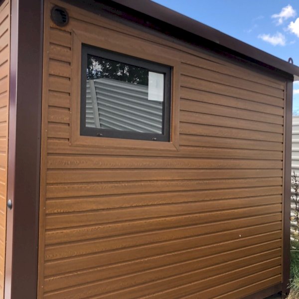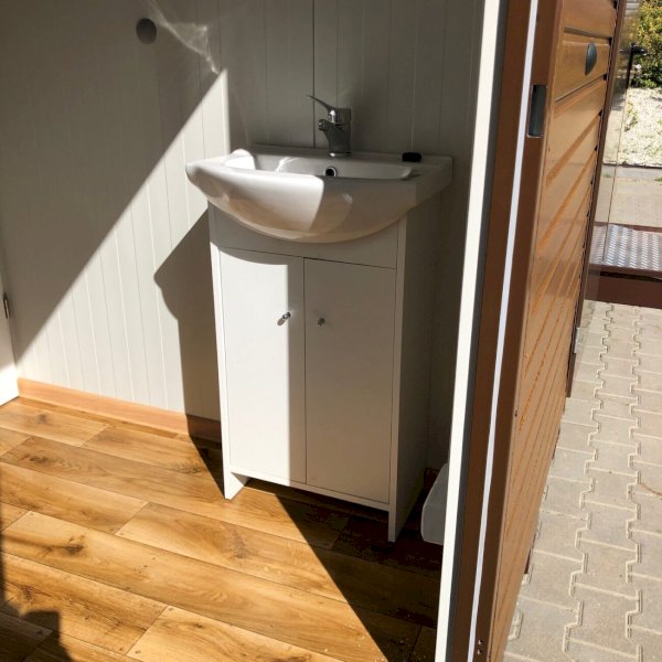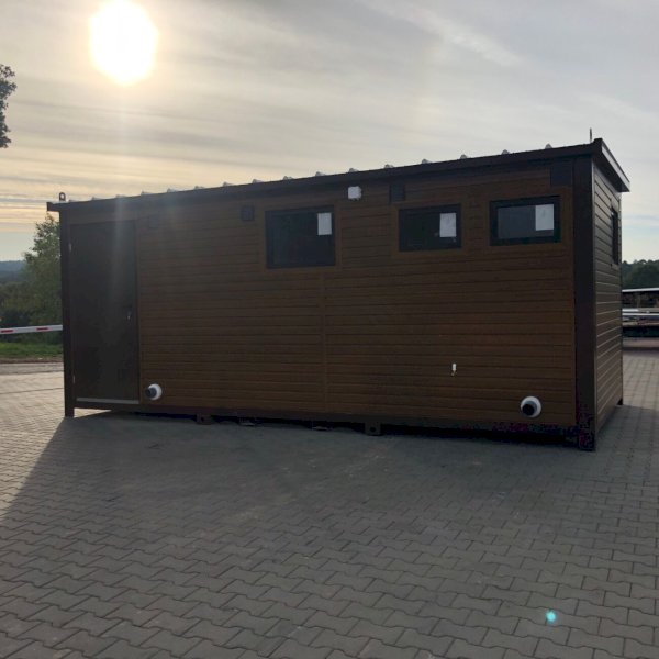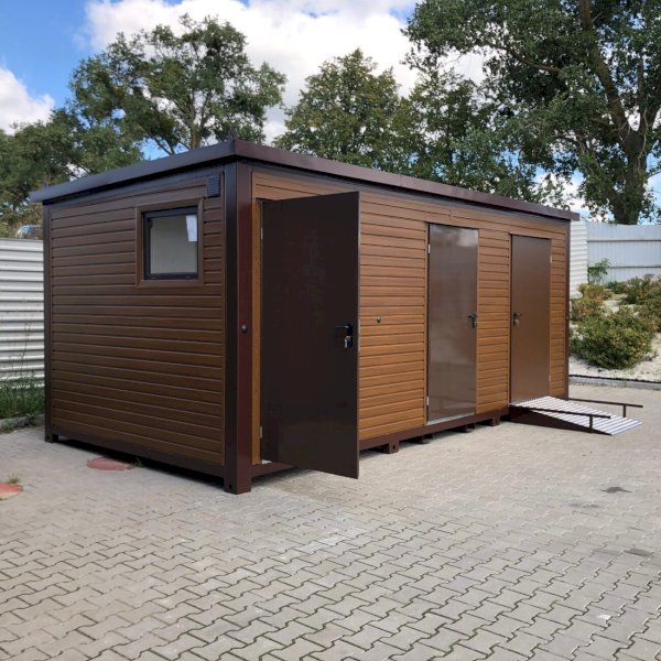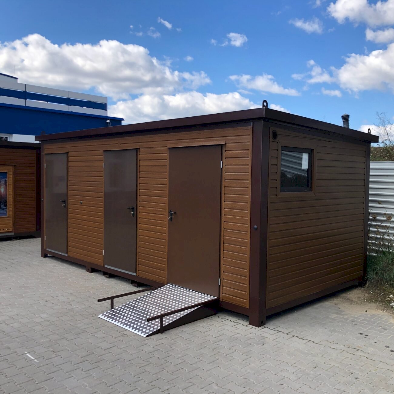 Nowoczesny kontener sanitarny o wymiarach 6,00 m x 3,00 m, wykonany w eleganckim kolorze złotego dębu. Funkcjonalny układ wnętrza obejmuje toalety damskie i męskie, pomieszczenie magazynowe oraz pełnowymiarową toaletę przystosowaną dla osób niepełnosprawnych z dedykowanym podjazdem. Idealne rozwiązanie dla przestrzeni publicznych, wydarzeń plenerowych oraz inwestycji komercyjnych.