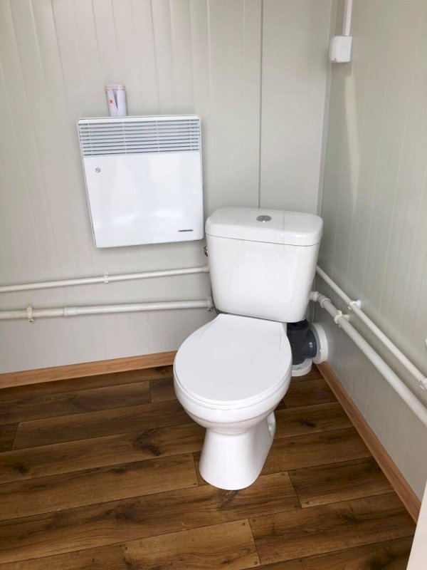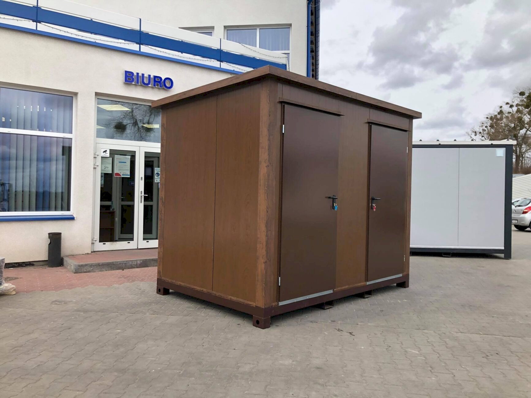 Funkcjonalny kontener sanitarny o wymiarach 3 m szerokości i 2 m głębokości, wyposażony w WC damsko-męski. Wykonany z fabrycznej płyty dostępnej w kolorze ciemny orzech lub złoty dąb.