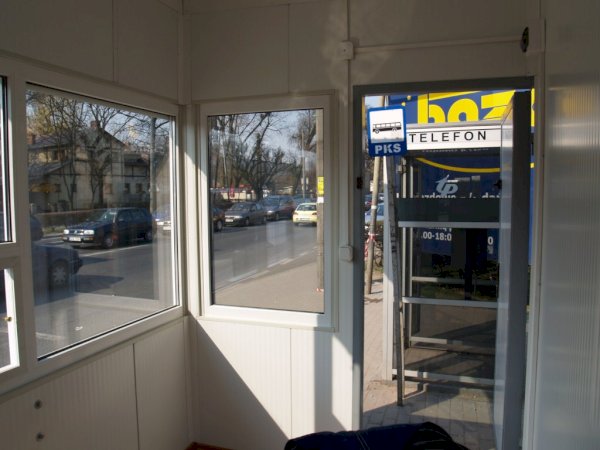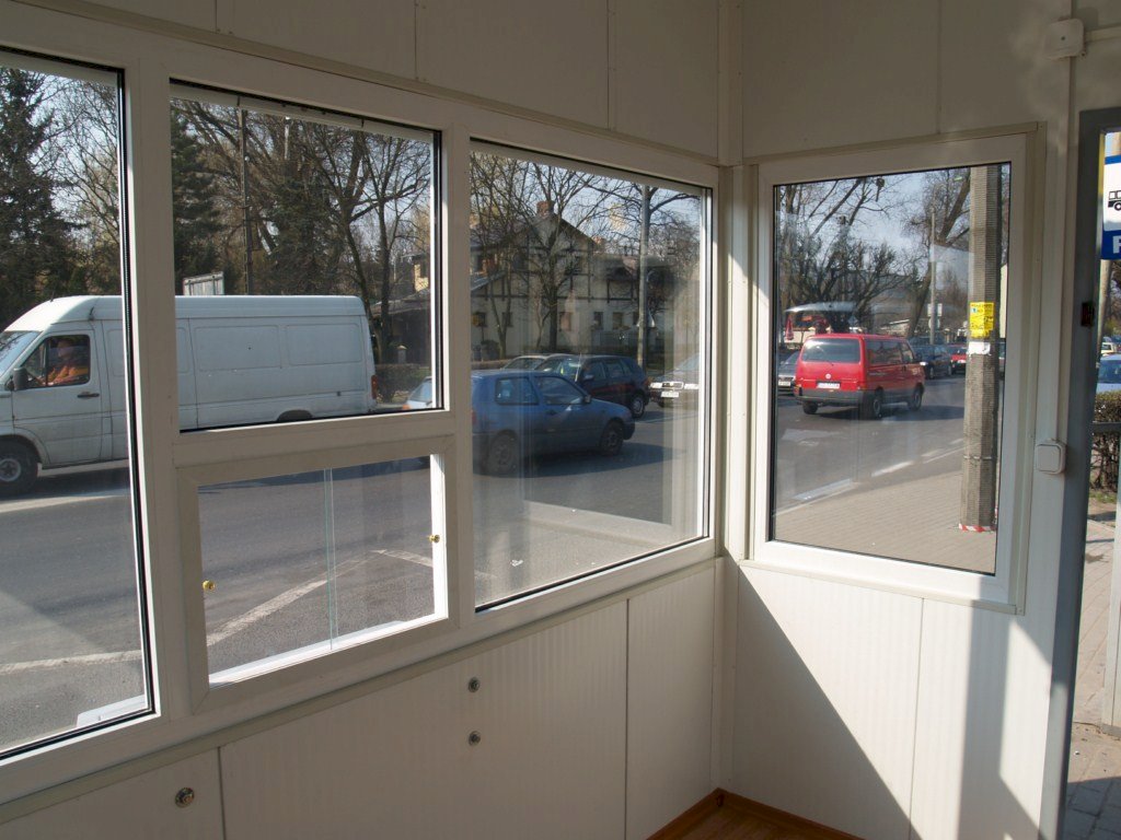 W wyposażeniu znajdują się okna PCV: okno podawcze, okno otwierane oraz witryna. Okna zabezpieczone są roletami metalowymi.