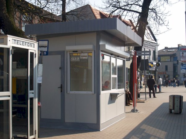 Kiosk ruchu o wymiarach 2438 mm głębokości x 2991 mm szerokości, wykonany w całości z płyty PIR o grubości 80 mm. Dach wykończony attyką.