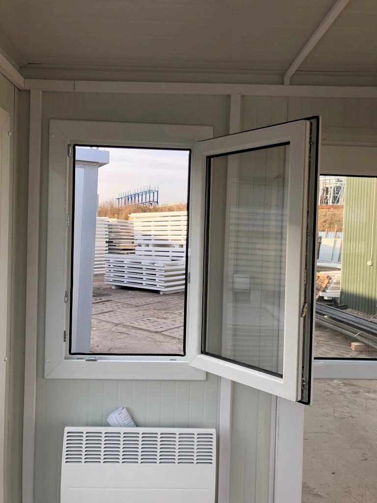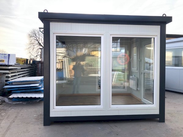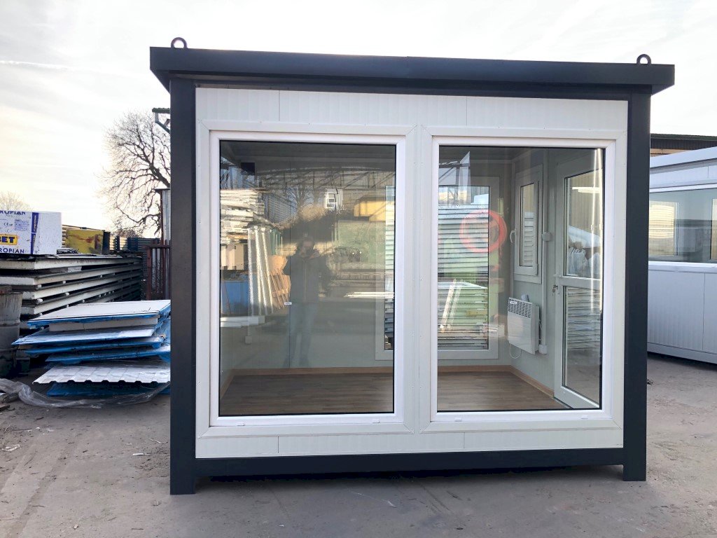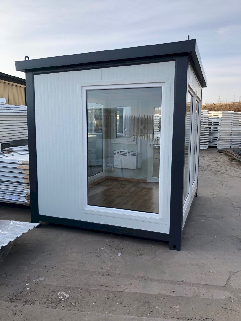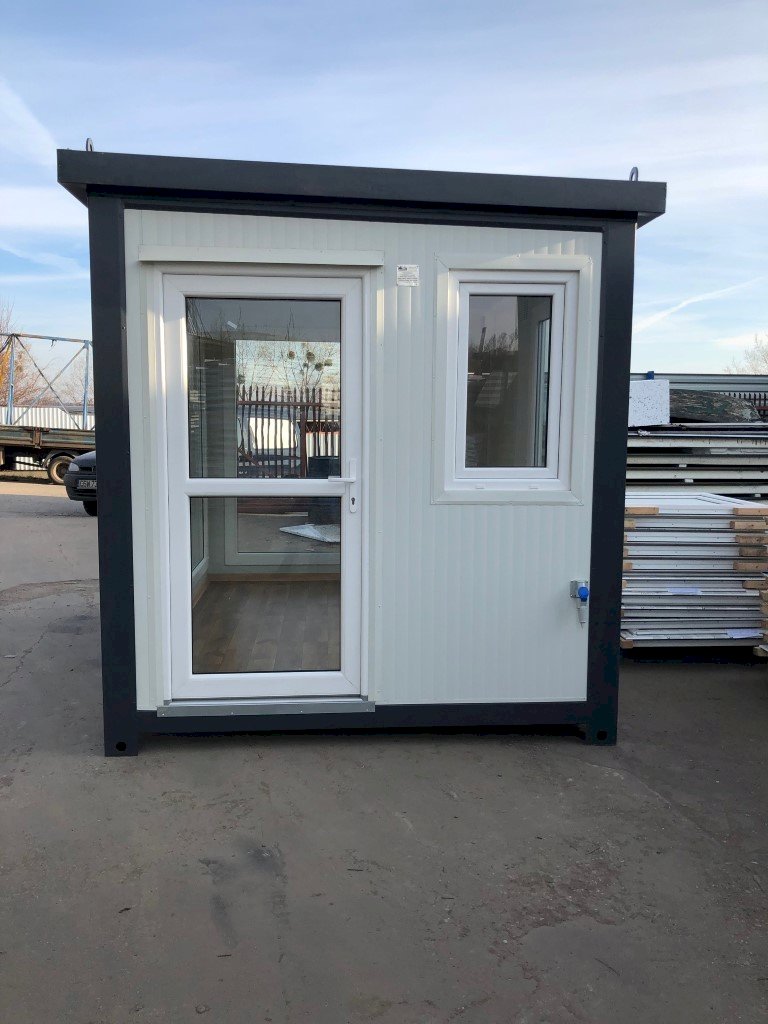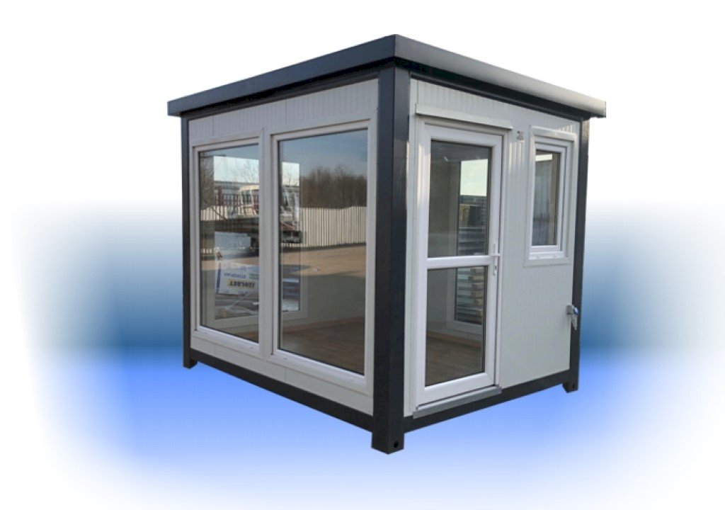 Nowoczesna stróżówka o wymiarach 3,00×2,40 m wyposażona w duże przeszklone witryny PCV. Doskonałe rozwiązanie dla punktów kontroli dostępu, ochrony lub obsługi klienta. Funkcjonalna, dobrze doświetlona i gotowa do użytkowania.